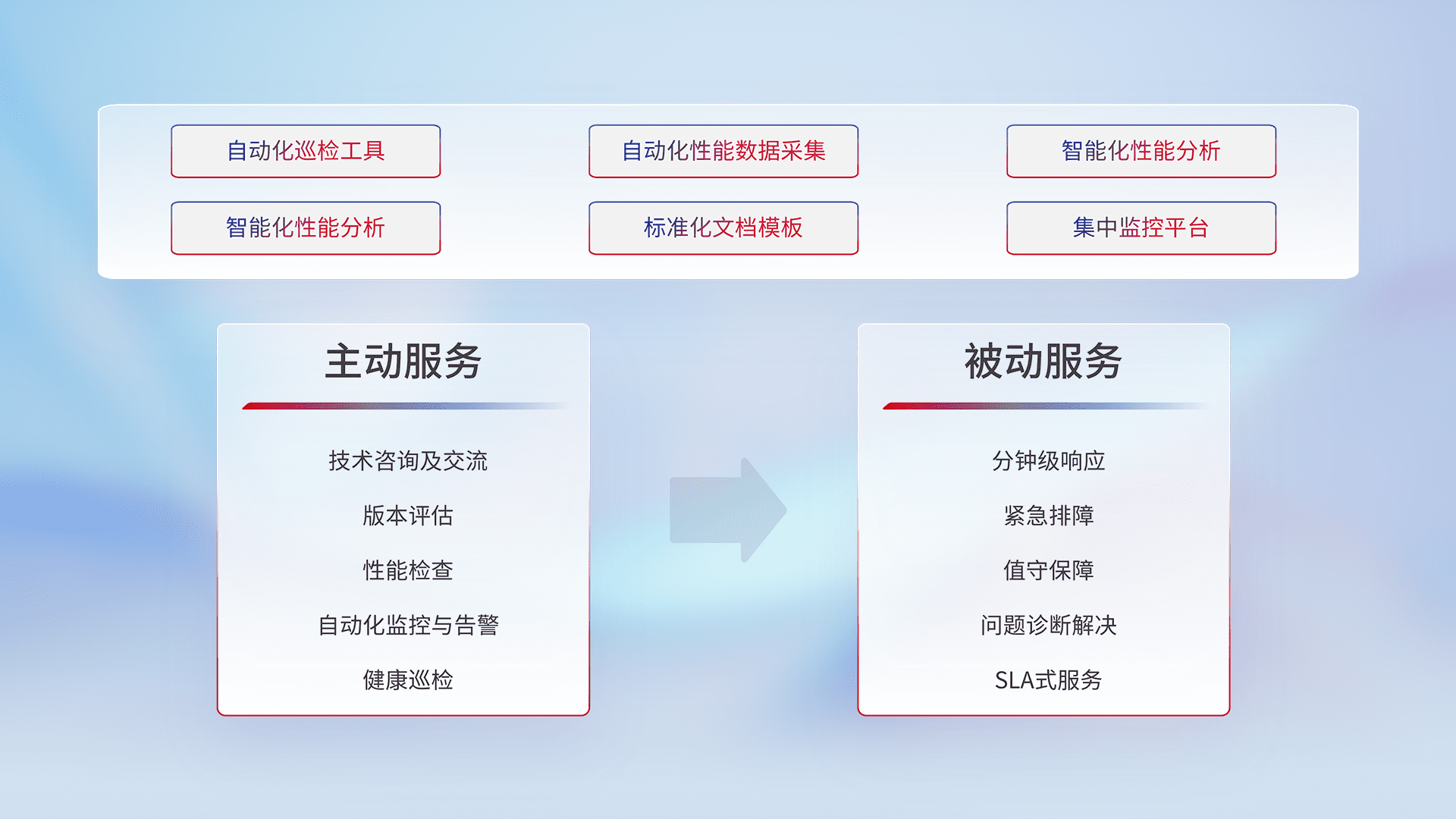 智能化工具和标准化文档,,,保障服务质量,,,提供主动服务(包含技术咨询、、版本评估、、、、性能检查、、、自动化监控与告警、、、健康巡检)和被动服务包含(分钟级响应、、紧急排障、、、值守保障、、、问题诊断解决、、SLA服务)。。。
