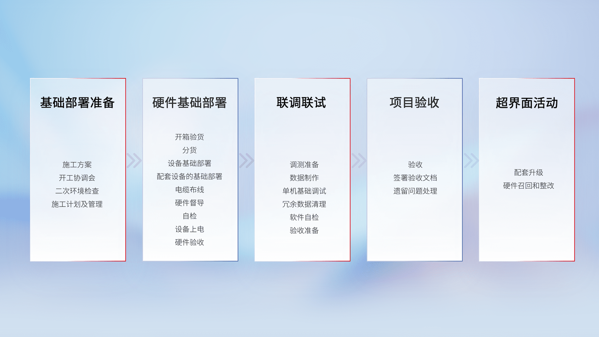 从基础部署准备、、、硬件基础部署、、、联调联试、、、项目验收、、、越界面活动的全过程可追溯,,保证施工质量和进度。。